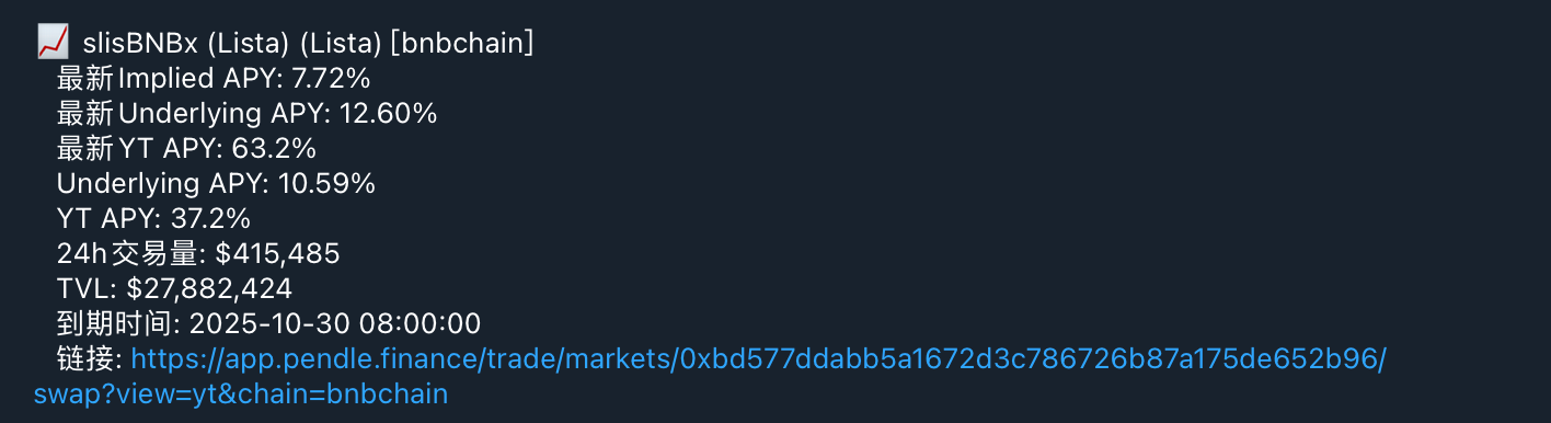 ⚠️ 免责声明:所有内容仅供学习分享交流,不构成任何投资决策依据 Pendle PT机会 30%+的收益还是很香的。 Pendle YT机会 最新YT APY高收益机会提醒 池子不大,小仓位搞搞,赚个猪脚饭。 定期理财机会 非稳定币务必做套保,不懂的可以加微信咨询,不懂不做。 Binance ZKC 7天200%,最大数量1000,合约资金费率降下来了,可以操作 Bybit PORTALS 3天350% 最大数量2500 闲钱永不眠跟踪 国庆假期,无操作。 闲大ETF股债轮动策略跟踪 今日操作:国庆假期,无 加密货…